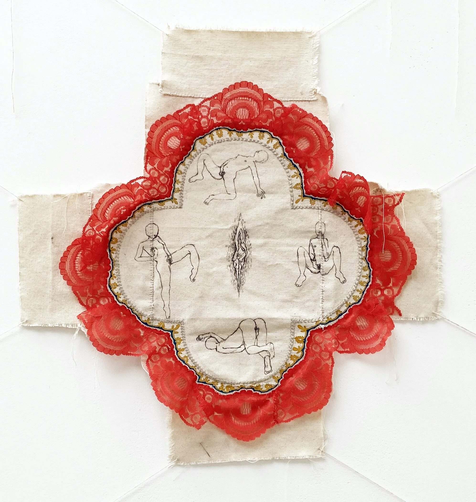 Pen, acrylic and lace on cotton canvas, 51 x 50cm, 2020