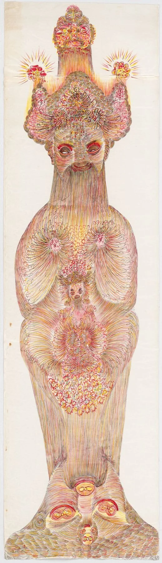 Aloise Corbaz also had her ailments, she was diagnosed with schizophrenia and placed in an asylum from 1918 to 1964, the year of her death. Corbaz’s work is ruled by flowers, ornaments, femininity, sexuality and sensuality. She (like a all the outsider artists suffering from a mental illness) had this compulsive and obsessive need (and desire) of exteriorising their pain through the physical act and release of making art. And that is why the number of works is always overwhelming, and each piece so rich. There is an undeniable meditative quality in the gestural act of making pattern; Fengyi and Corbaz are the best example of that.